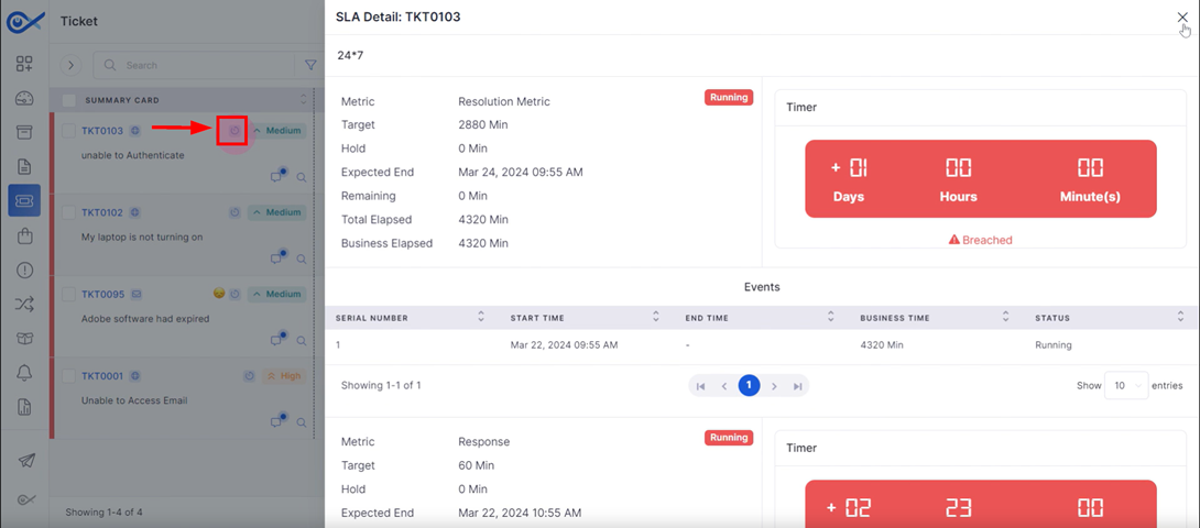 Real-time **“Service Level Agreement (SLA)”** metrics are readily accessible within the ticket interface, allowing for proactive monitoring of performance against agreed-upon service levels.