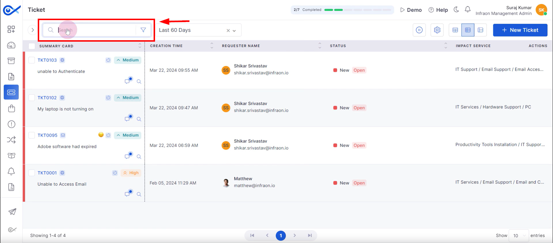 <img src="https://8249392-files.gitbook.io/~/files/v0/b/gitbook-x-prod.appspot.com/o/spaces%2FE4mkwSP8a1BSD9BFNFav%2Fuploads%2FP4cBxPfitWh1j3VMY865%2F0.png?alt=media" alt="Right pointing backhand index" data-size="line"> Locating the **“Search”** option on the top panel will assist technicians in finding a specific ticket based on its ID, requester, and more.