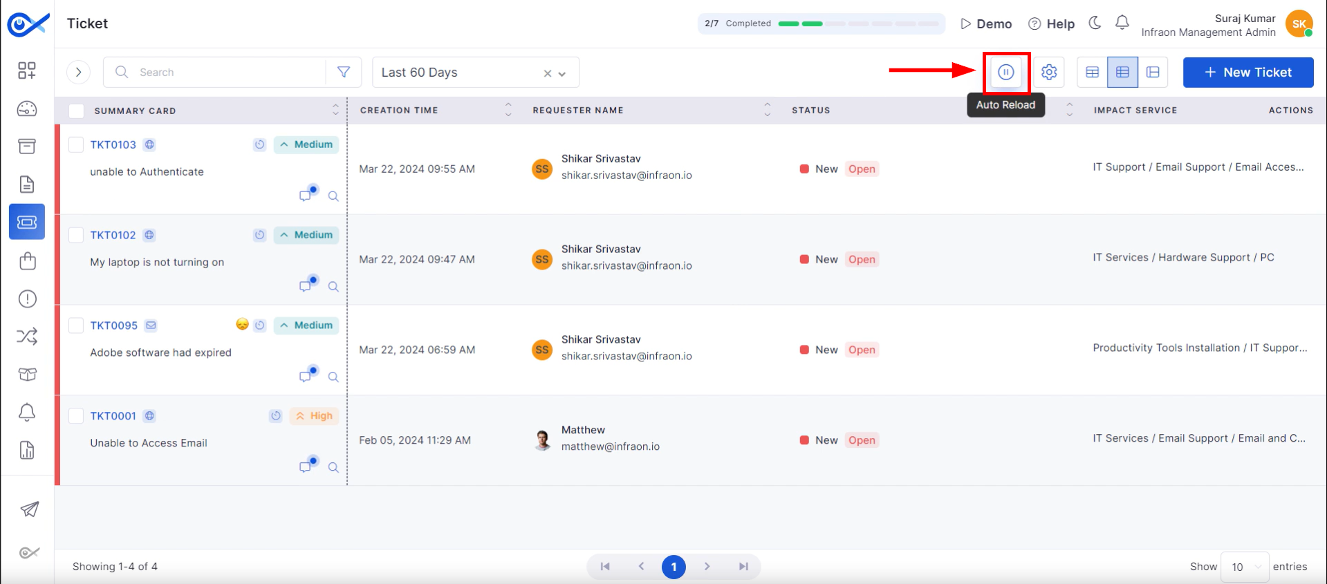 <img src="https://8249392-files.gitbook.io/~/files/v0/b/gitbook-x-prod.appspot.com/o/spaces%2FE4mkwSP8a1BSD9BFNFav%2Fuploads%2FRDFzySWS85peLUG3cmbX%2F6.png?alt=media" alt="Right pointing backhand index" data-size="line">The top panel includes an “Auto-Reload” feature, which refreshes the page every five minutes by default. This allows for real-time updates on ticket statuses. To manually disable this feature, click the auto-reload icon.