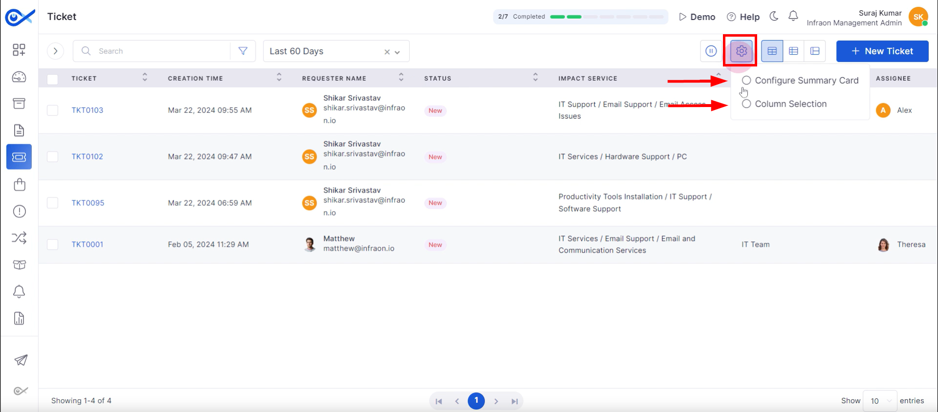 The smart grid offers a **“Configure Summary Card”** option, enabling users to customize the card's content. This includes adding ticket source and analysis details and toggling the visibility of impact and severity indicators. Alternatively, the impact status can be displayed directly on the main page by selecting the corresponding option and saving the changes.