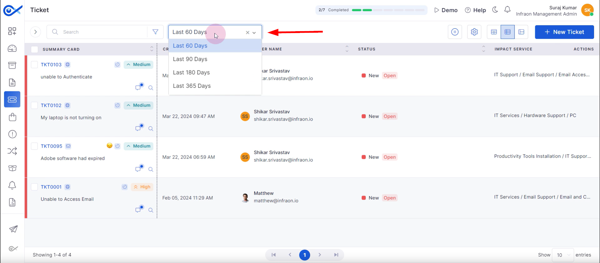 <img src="https://8249392-files.gitbook.io/~/files/v0/b/gitbook-x-prod.appspot.com/o/spaces%2FE4mkwSP8a1BSD9BFNFav%2Fuploads%2F1g0Mu9xHo1gmtiRpdTeQ%2F4.png?alt=media" alt="Right pointing backhand index" data-size="line"> Adjacent to the search and filter options is a **“Timeframe Selector,”** which enables users to view tickets within specific timeframes, such as the past thirty, sixty, or ninety days or the entire previous year.