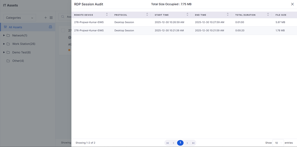 <table data-header-hidden><thead><tr><th width="178.5999755859375"></th><th width="210.39990234375"></th><th></th></tr></thead><tbody><tr><td><strong>Label</strong> </td><td><strong>Action</strong> </td><td><strong>Description/ Example</strong> </td></tr><tr><td><strong>Search</strong> </td><td>Search for the required asset. </td><td></td></tr><tr><td><strong>Filter</strong> </td><td>Filter can be added based on the field (Card name, card type, device IP, part number, and serial number) and condition from the drop-down box below. </td><td></td></tr><tr><td><strong>Actions</strong></td><td></td><td></td></tr><tr><td><strong>Scan &#x26; Search Asset</strong> </td><td>Search by barcode: type the asset's code. </td><td>To scan and search for an asset, click on the 'Scan and search asset' option, then use your phone to scan the QR code, which will initiate the asset search process. </td></tr><tr><td><strong>Export</strong> </td><td>Click to choose the category. </td><td>To export the data, click the 'Export' button, then choose the desired category, and finally download the CSV file containing the selected data. </td></tr><tr><td><strong>Maintenance</strong> </td><td>Click to redirect to the Maintenance page. </td><td>When an asset is designated for maintenance, its status is changed to the "maintenance" stage. After scheduling the maintenance time, the asset is set to run automatically during that scheduled period. Once the maintenance is completed, the asset reverts back to its previous state, resuming normal operations or the state it was in prior to the maintenance activity. </td></tr><tr><td><strong>Bulk Edit</strong> </td><td><ul><li>Go to the Infraon Asset Card page -> Actions -> Bulk Edit. </li><li>Select the Category. </li><li>Download the CSV file (excel sheet) and Enter the Asset details in the sheet. </li><li>Upload the same edited CSV file. </li><li>Click <strong>Next</strong> -> <strong>Import</strong> -> <strong>Proceed with Valid Records.</strong> </li></ul></td><td>To Edit Multiple Assets information or details at once. </td></tr><tr><td><strong>Download Agent</strong> </td><td>Click to download the Infraon agent available on Windows, MAC, and Linux. </td><td></td></tr><tr><td><strong>Customize Asset ID</strong> </td><td>To customize the Asset ID configuration. </td><td></td></tr><tr><td><strong>CLI Session</strong></td><td>Click to navigate back to the CLI session module.</td><td>CLI Jobs/sessions in NCCM create direct CLI sessions (SSH or TELNET) between the Device and the User through the NCCM application.</td></tr><tr><td><strong>Download Job</strong></td><td>Click to navigate back to the Download Job module.</td><td>NCCM’s Download Jobs added through Discovery process or manual Device addition will start downloading Device configurations, Operational Data, Device Inventory Details, OS image details based on “Configuration Profile” assigned, Device Credentials, Connection &#x26; Download protocol selection and Schedule period.</td></tr><tr><td><strong>RDP Session Audit</strong></td><td>View RDP session details.</td><td><p>Opens the RDP Session Audit window for the selected asset. Users can view a list of RDP sessions, including the remote device name, protocol used, session start and end times, total duration, and the recorded session file size.</p><p> </p><p>The page also shows the total storage size occupied by the recorded sessions.</p></td></tr></tbody></table>
