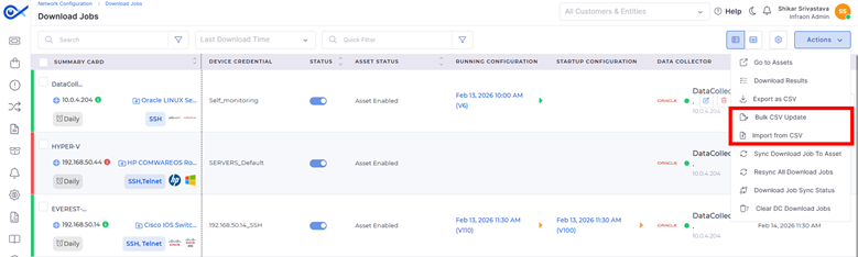<table data-header-hidden><thead><tr><th width="161"></th><th width="217"></th><th></th></tr></thead><tbody><tr><td><strong>Label</strong></td><td><strong>Action</strong></td><td><strong>Description/ Example</strong></td></tr><tr><td>Search</td><td>Search for the required download job.</td><td>Search by device credentials, asset ID, name, etc., to quickly locate a specific download job.</td></tr><tr><td>Filter</td><td>Apply a filter based on field conditions.</td><td>Filters can be applied to various fields, including IP address, device credentials, vendor, status, and configuration type. Conditions include equals, contains, etc.</td></tr><tr><td>Date Range</td><td>Filter download jobs by a specified time frame.</td><td>Select time ranges such as the current hour, last 30 minutes, last hour, etc., to narrow down job history.</td></tr><tr><td>Go to Assets</td><td>Navigate to the asset module homepage.</td><td>Redirects to the IT Assets module to manually add or manage devices and download jobs.</td></tr><tr><td>Download Results</td><td>View the results of download jobs.</td><td>Opens a pop-up displaying the status and outcome of configuration downloads, including device name, IP address, status (success/failure), and error logs.</td></tr><tr><td>Column Selection</td><td>Customize the columns shown on the page.</td><td>It allows users to modify which columns appear in the table by dragging and dropping them from 'Available' to 'Selected'. Columns can also be rearranged or frozen.</td></tr><tr><td>Export</td><td>Export download job data to a CSV file.</td><td>Download a CSV file containing details of all download jobs for offline use.</td></tr><tr><td>Bulk CSV Update</td><td>Edit multiple download jobs at once via CSV.</td><td><p>Follow the steps outlined below to complete the import successfully:</p><ul><li>Download the sample CSV template to ensure proper data structure.</li><li>Enter the required information into the CSV file accurately.</li><li>Upload the completed CSV file and click "Next."</li><li>Review the system’s column mapping, adjust if necessary, and click "Import."</li></ul></td></tr><tr><td>Import from CSV</td><td>Add download jobs in bulk via CSV.</td><td><p>Upload a CSV file with the respective fields, then review and import the jobs after verifying the data.</p><p><br><strong>Import from CSV File</strong></p><ul><li>Download the CSV file (excel sheet) and enter the respective fields in the sheet. </li><li>Upload the same edited CSV file.</li><li>Click <strong>Next</strong> -> <strong>Import</strong> -> <strong>Proceed with Valid Records.</strong></li></ul></td></tr><tr><td><strong>Column Details</strong></td><td></td><td></td></tr><tr><td>Summary Card</td><td>Click any field to view detailed information.</td><td><p>This displays a summary of the download job, including the name, IP address, configuration profile, and associated device credentials.</p><p><br><strong>Example:</strong> Error in making a connection to the device. Verify the connection commands in the Configuration Profile are valid and check the Download Job Audit for finding the invalid command</p></td></tr><tr><td>Device Credential</td><td>View-only field, no actions.</td><td>Displays the device credentials associated with the download job.</td></tr><tr><td>Status</td><td>View-only field, no actions.</td><td>Indicates the operational status of the download job.</td></tr><tr><td>Running Configuration</td><td>Click to view the running configuration.</td><td><p>The pop-up window displays the current running configuration, including the download date and time. Search and export options (.txt) are available.</p><p>(Where Device Connection and Download Commands are maintained)</p><p><strong>Example:</strong> Download Time: Dec 23, 2024, 12:10 PM (V33).</p></td></tr><tr><td>Startup Configuration</td><td>Click to view the start-up configuration.</td><td><p>The pop-up window displays the current start-up configuration, including the download date and time. Search and export options (.txt) are available.</p><p>(Where Device Connection and Download Commands are maintained)</p><p><strong>Example:</strong> Download Time: Dec 23, 2024, 12:10 PM (V25).</p></td></tr><tr><td>Agent</td><td>View-only field, no actions.</td><td>Displays the agent name, IP address, and vendor details associated with the download job.</td></tr><tr><td>Next Action Time</td><td>View-only field, no actions.</td><td>Displays the scheduled time for the next action associated with the download job.</td></tr><tr><td>Last Action Time</td><td>View-only field, no actions.</td><td>Displays the timestamp of the last action performed on the download job.</td></tr></tbody></table>